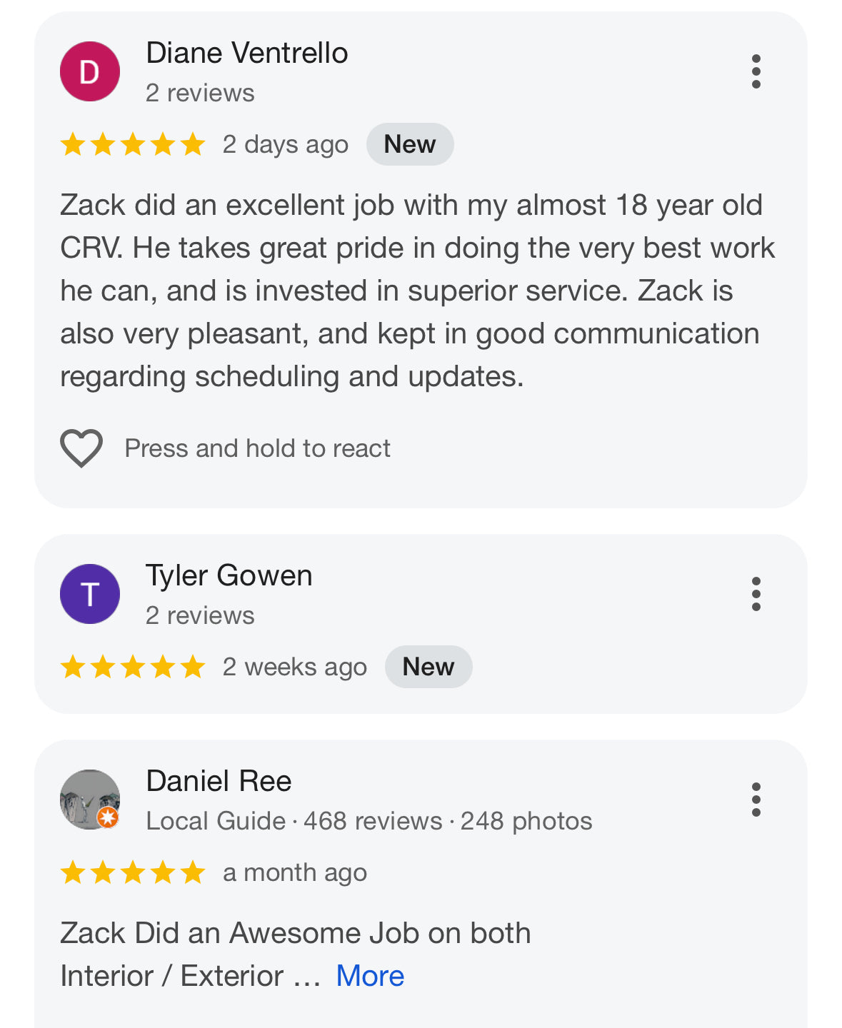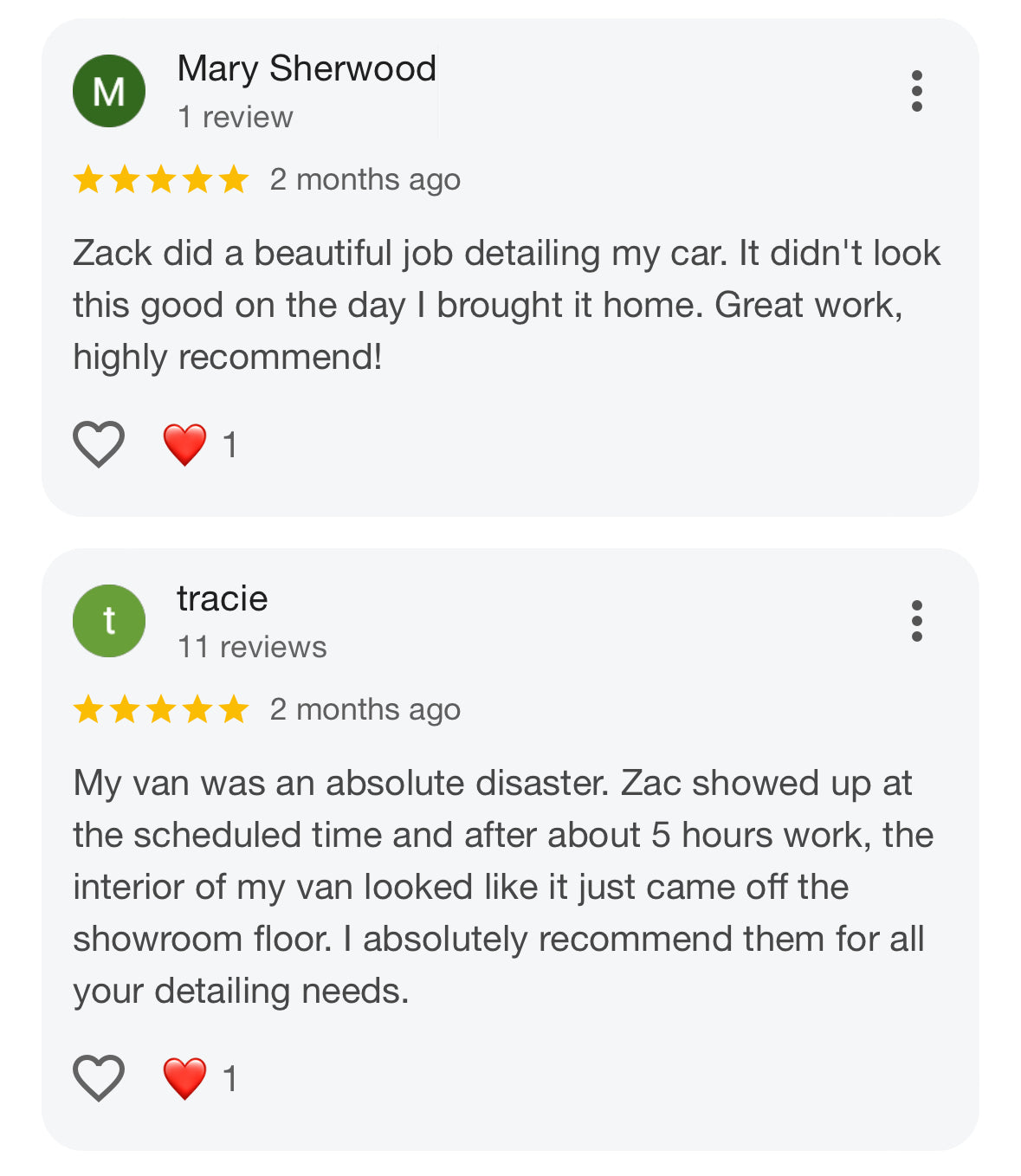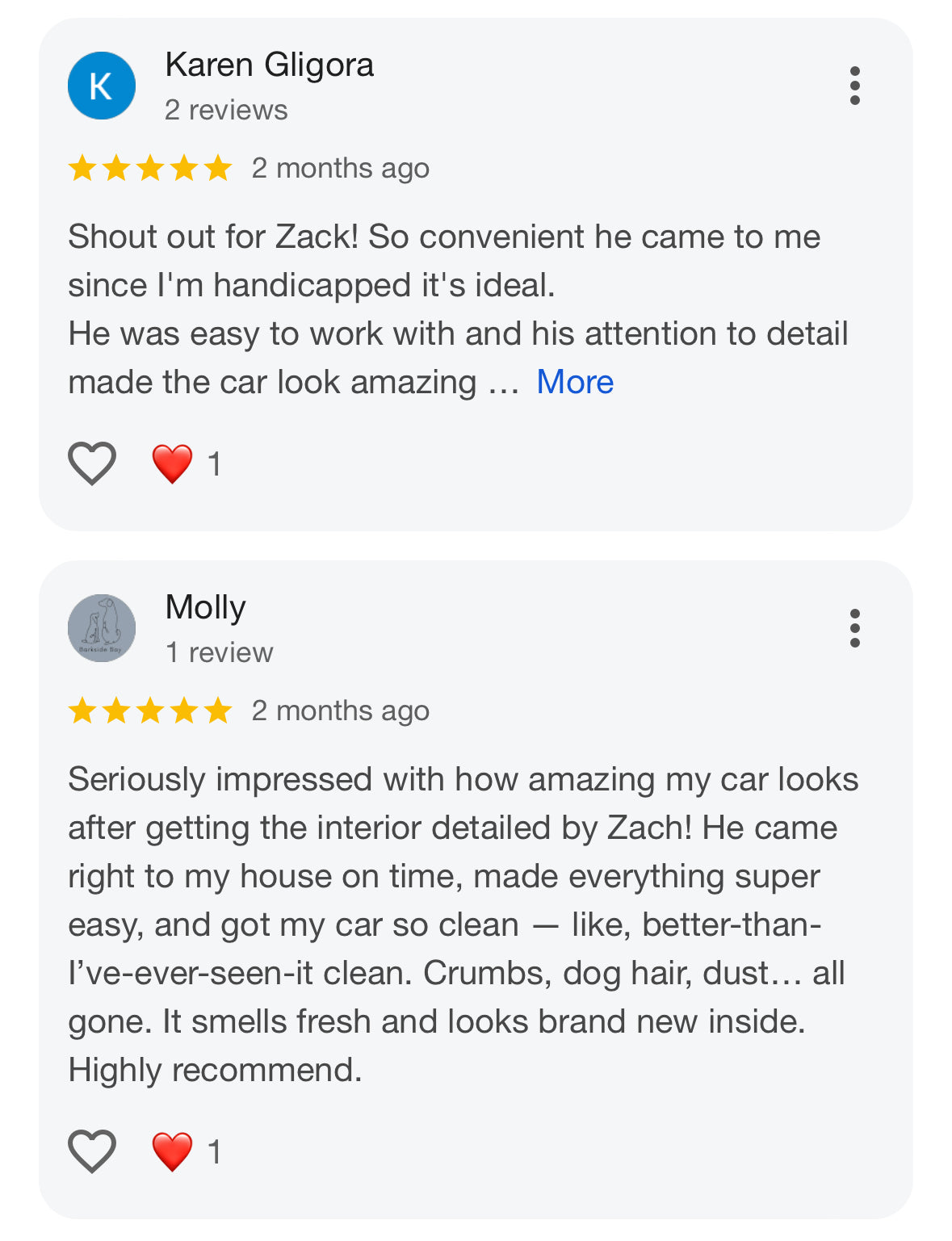 Our professional mobile car detailing service surpasses traditional drive-through car washes and vacuums with unparalleled convenience, superior quality, and eco-friendly materials, while significantly reducing water usage for a more sustainable clean, along with the customer service!